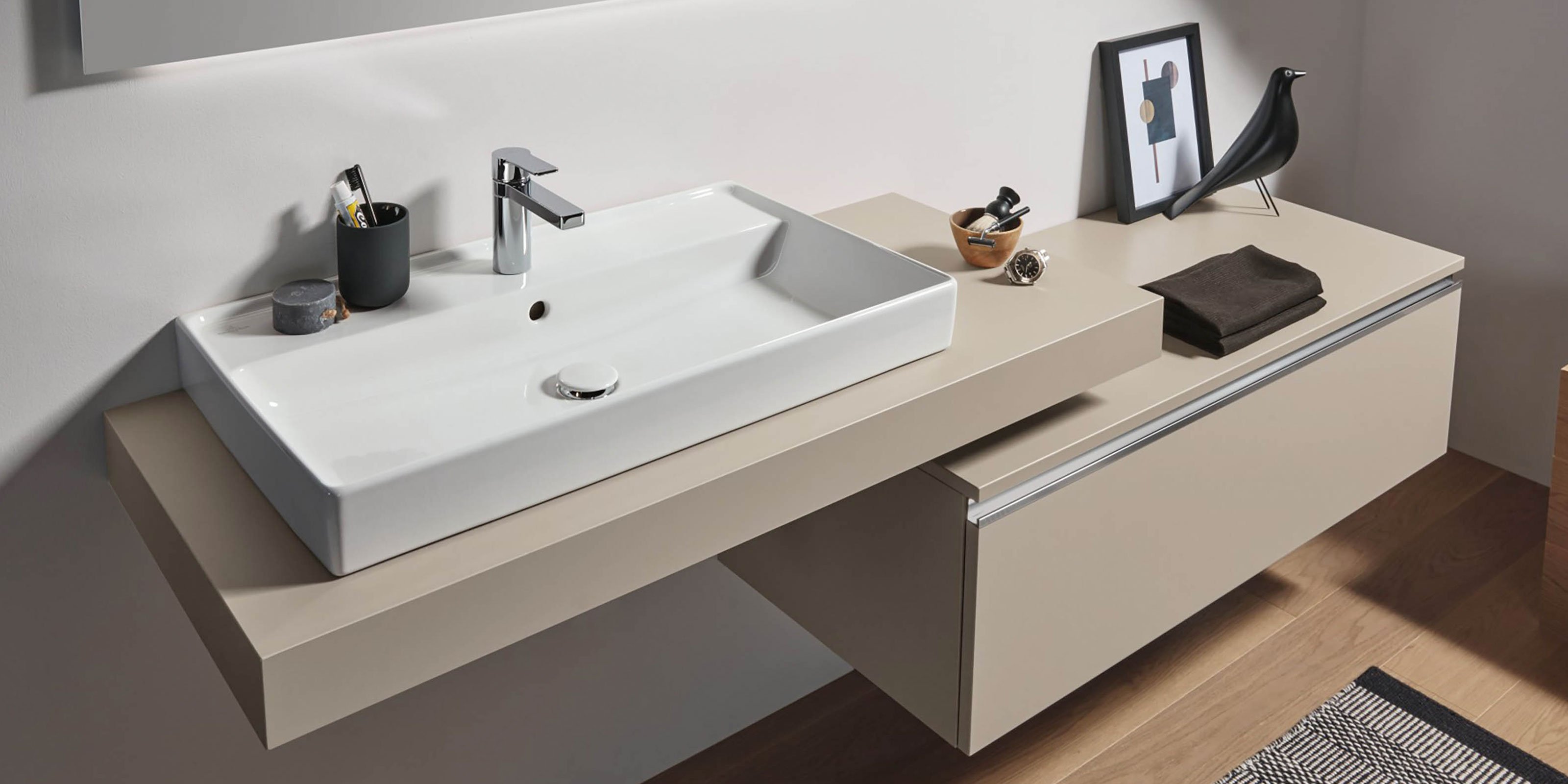 Das geräumige Solitärmöbel in Sandgrau-Matt und die gleichfarbige 2morrow Platte Classic ergänzen sich optimal. Die schwebende, asymmetrische Anordnung sorgt für Stauraum mit großzügigen Ablageflächen und erzeugt dabei eine Leichtigkeit, die durch den Reflection Lichtspiegel LUCA noch unterstützt wird. Zusammen mit platzsparenden Cubes in Kontrastfarbe entsteht eine moderne Badlösung.