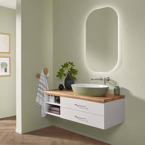 Extra-Slim, Slim-Light, Slim, Massivholz, Classic und Light in unterschiedlicher Optik – modellabhängig mit oder ohne LED, zusätzlich in Bi-Color. Flexible Gestaltung mit breiter oder schmaler vertikaler Platte. Fronten wahlweise mit Griff, mit Griffleiste oder grifflos mit integrierter Technik Push to open. Clevere Details wie ein Wäschebehälter im Schrank, eine Sitztruhe für mehr Komfort und vieles mehr. Maßflexible, offene Regale in nahezu allen Breiten ermöglichen auch in schwierigen Raumsituationen die passgenaue Planung. Verschiedene Keramik-Becken oder edle Glas-Waschbecken wählbar. Imposante Auswahl an Größen, Formen, Materialien und Farben für jeden Einrichtungsstil
