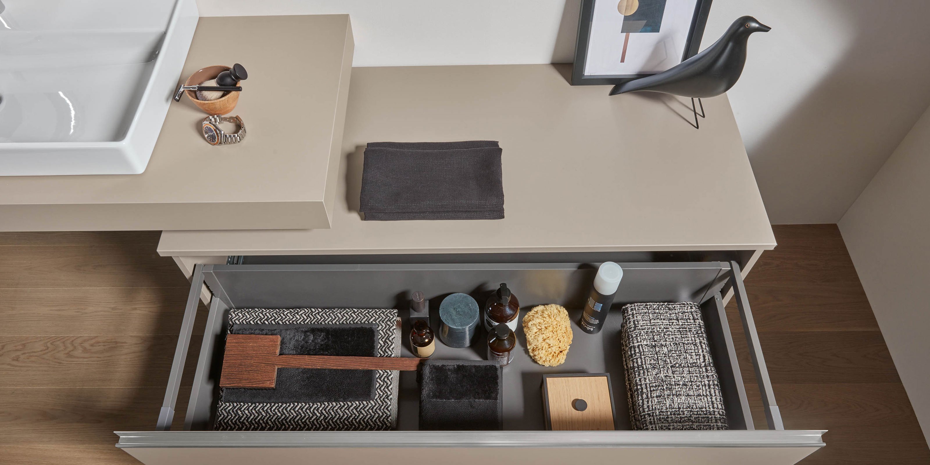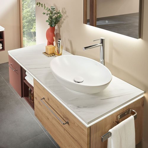 2morrow bietet ein flexibles Baukastensystem für die individuelle Badgestaltung. Die Basis bildet eine elegante, variable Platte in sechs Ausführungen, die als Fundament für Aufsatzwaschtische dient. Dieses System wird ideal durch Unterschränke, Anbauschränke und Regale ergänzt, die vielfältigen Stauraum schaffen.
